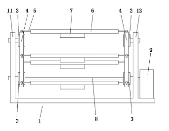 進一步改進的實施例,所述傳動軸8的左右端分別固定連接在左、右側(cè)的下鏈輪3上。傳動軸8設(shè)置在下鏈輪3上,便于電機9的安裝,此時的電機9可直接放置的底座1上。另外,所述底座1為鋁合金構(gòu)件。