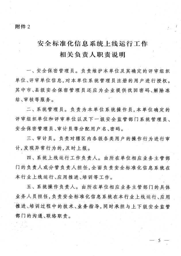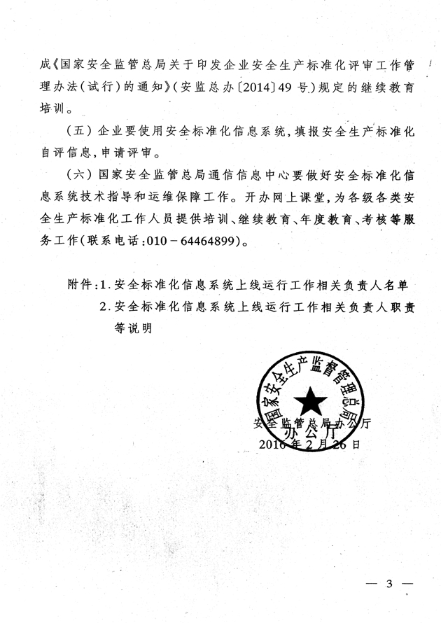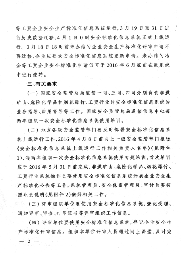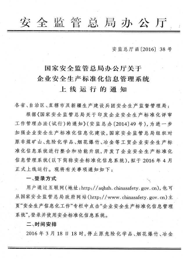 近日,國(guó)家安全監(jiān)管總局辦公廳下發(fā)了《關(guān)于企業(yè)安全生產(chǎn)標(biāo)準(zhǔn)化信息管理系統(tǒng)上線運(yùn)行的通知》(安監(jiān)總廳函〔2016〕38號(hào)),對(duì)安全標(biāo)準(zhǔn)化信息管理系統(tǒng)的使用提出具體要求,F(xiàn)轉(zhuǎn)發(fā)你們,并提出以下要求,請(qǐng)一并貫徹執(zhí)行。