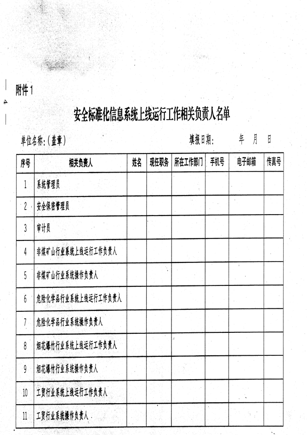 二、按時(shí)報(bào)送相關(guān)負(fù)責(zé)人名單。各市要于4月8日前將標(biāo)準(zhǔn)化信息系統(tǒng)上線運(yùn)行相關(guān)負(fù)責(zé)人名單報(bào)送至省局,以便及時(shí)安排業(yè)務(wù)培訓(xùn)。相關(guān)負(fù)責(zé)人因工作調(diào)整發(fā)生變化的,要及時(shí)進(jìn)行補(bǔ)報(bào)。所報(bào)負(fù)責(zé)人均應(yīng)為各市局機(jī)關(guān)在編正式人員。冶金有色建材與機(jī)械等工貿(mào)行業(yè)分處(科)監(jiān)管的,在總局通知附件1的基礎(chǔ)上分別報(bào)送。